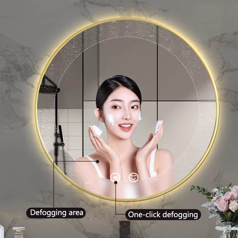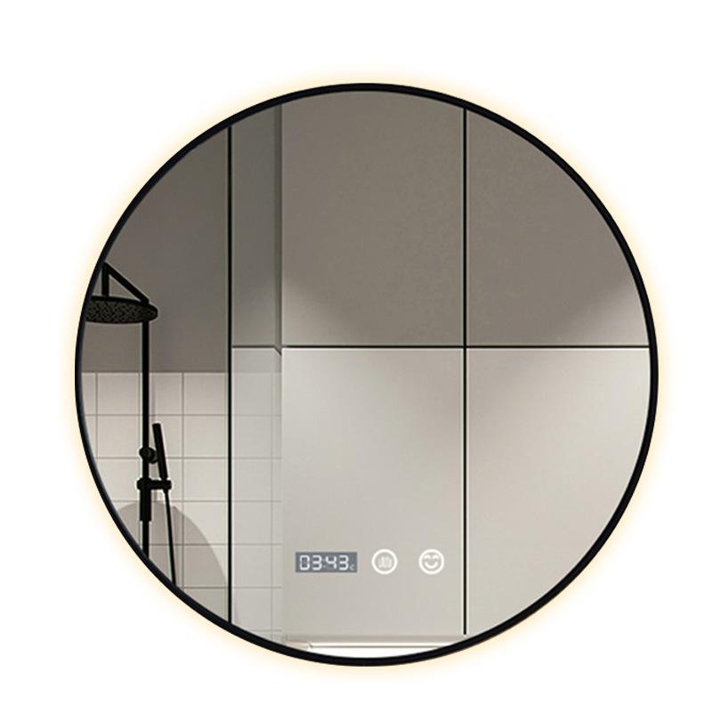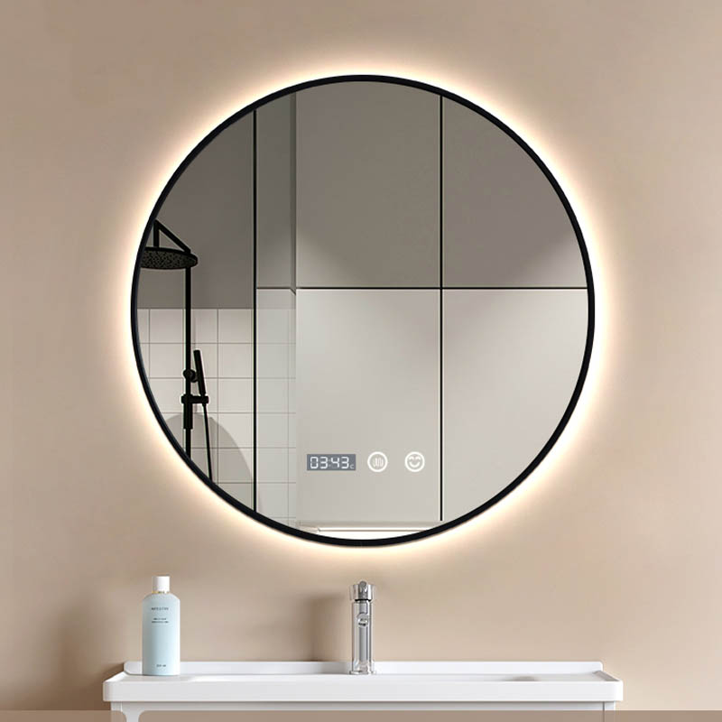 Human body sensor smart round mirror with frame and LED light, bathroom mirror, anti-fog and luminous, toilet makeup mirror, no drilling required, wall-mounted.